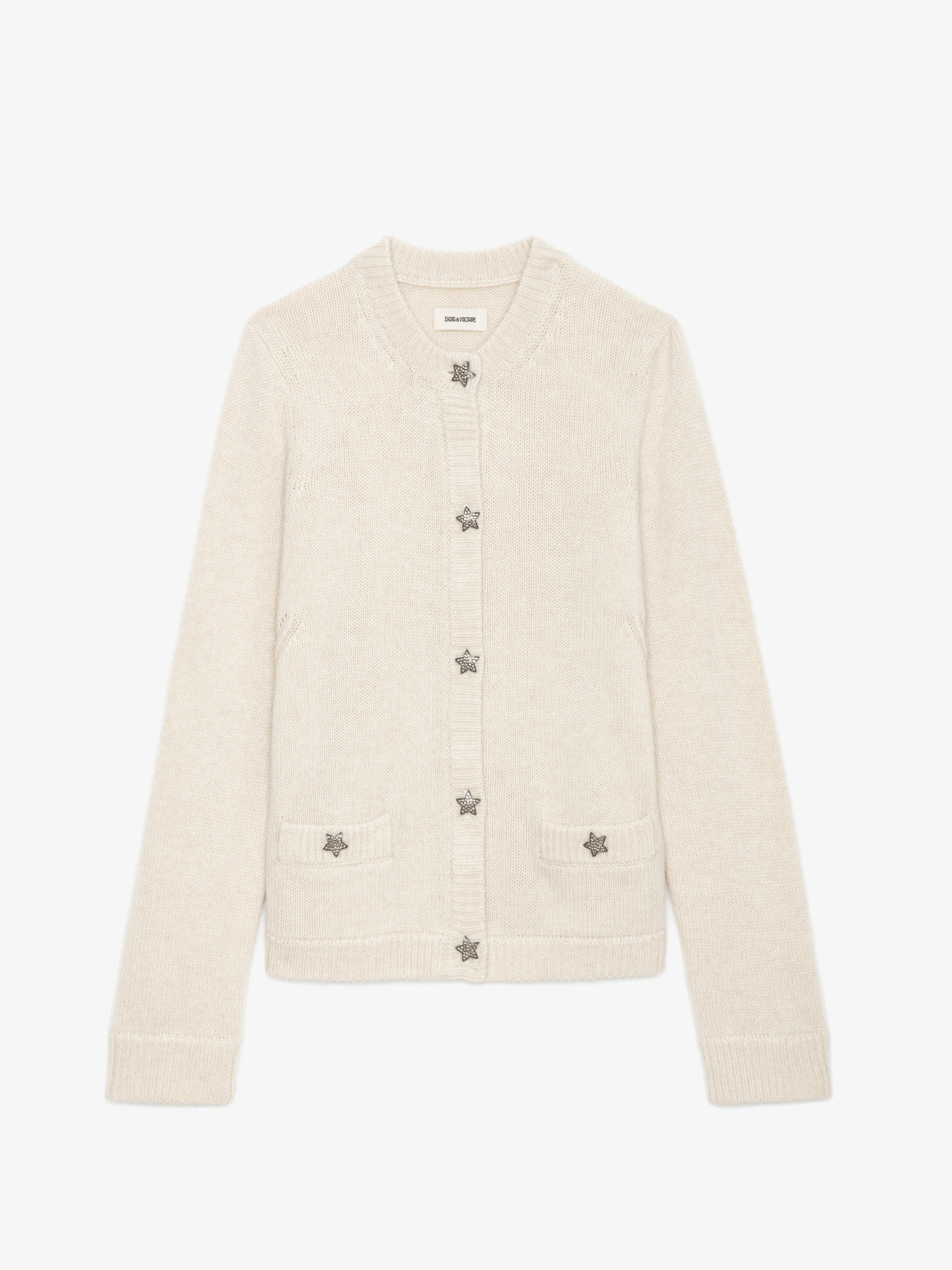 Ecru 100% cashmere cardigan with pockets and star-shaped embellished jewel buttons.See more