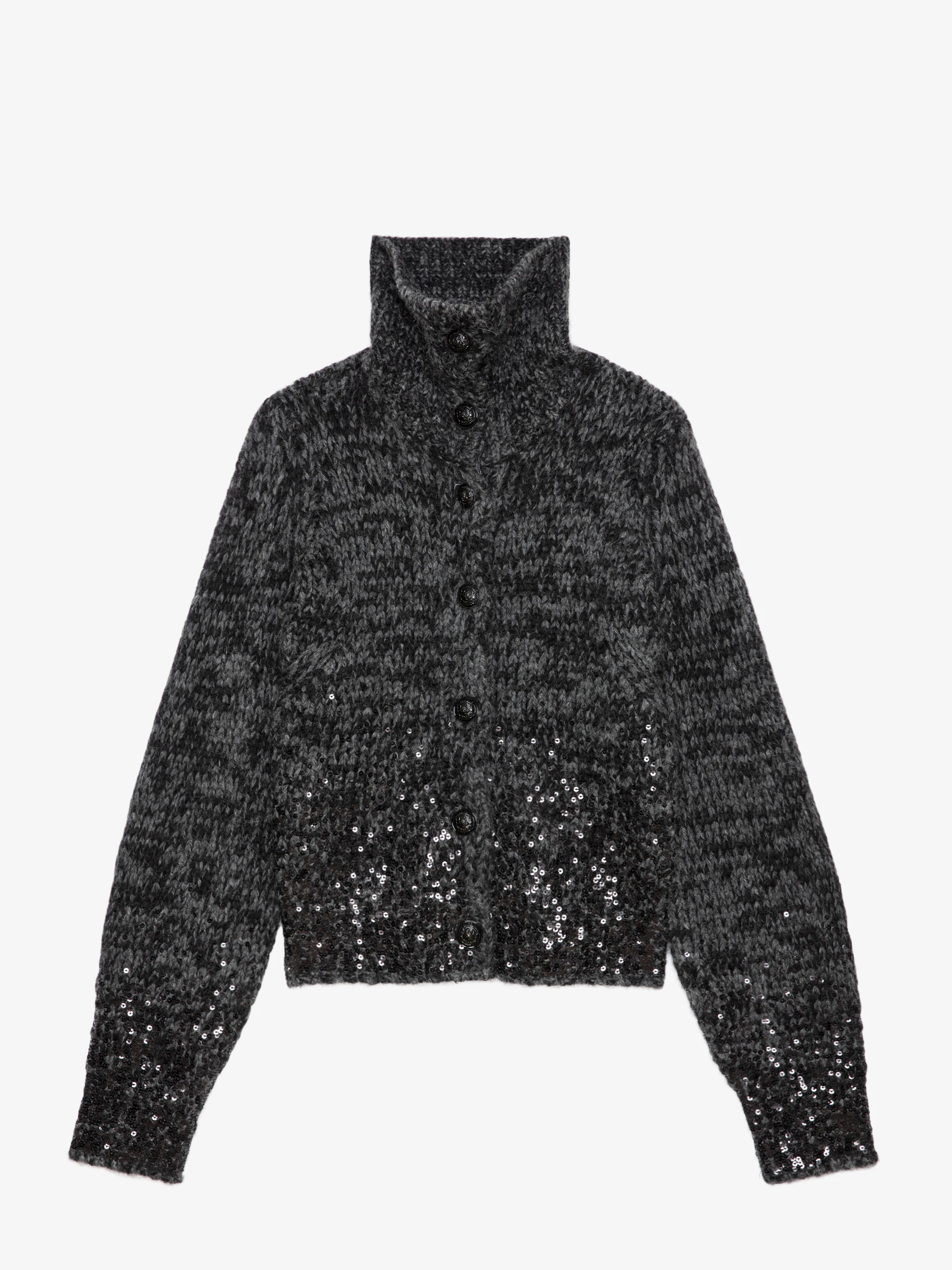 Short jacket in anthracite tweed-effect knit with funnel neck, button fastening and sequin embroidery.See more