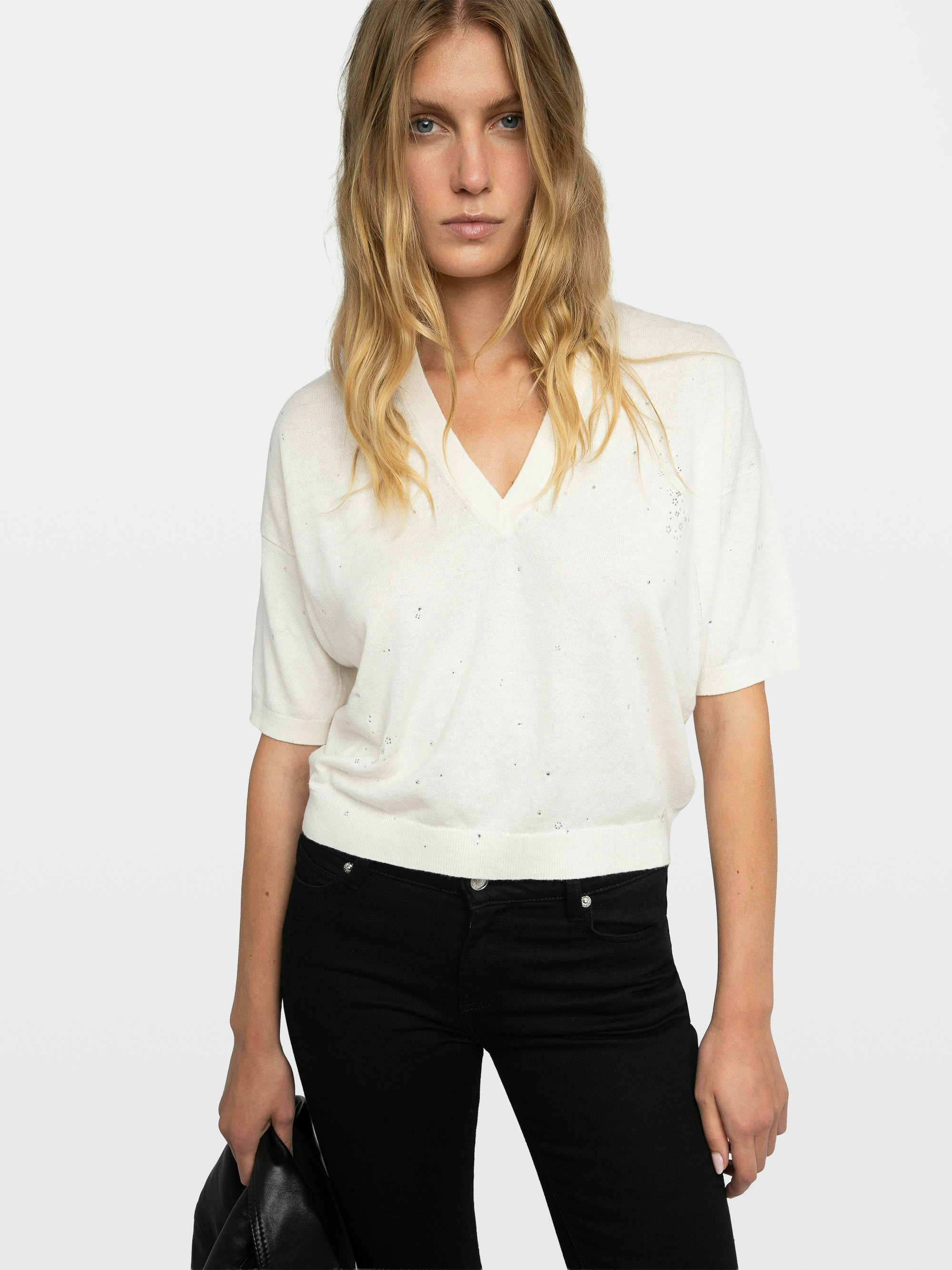 Cozy meets cool with a touch of sparkle. This ultra-soft white rhinestone sweater wraps you in effortless warmth without losing its edge. Shimmering crystal accents trace the neckline and scatter across the front, delivering refined, rock-chic glamour. A clean V neck and short sleeves let the white rhinestone sweater layer under leather or stand alone over denim, carrying laid-back polish from crisp mornings to late-night sets.