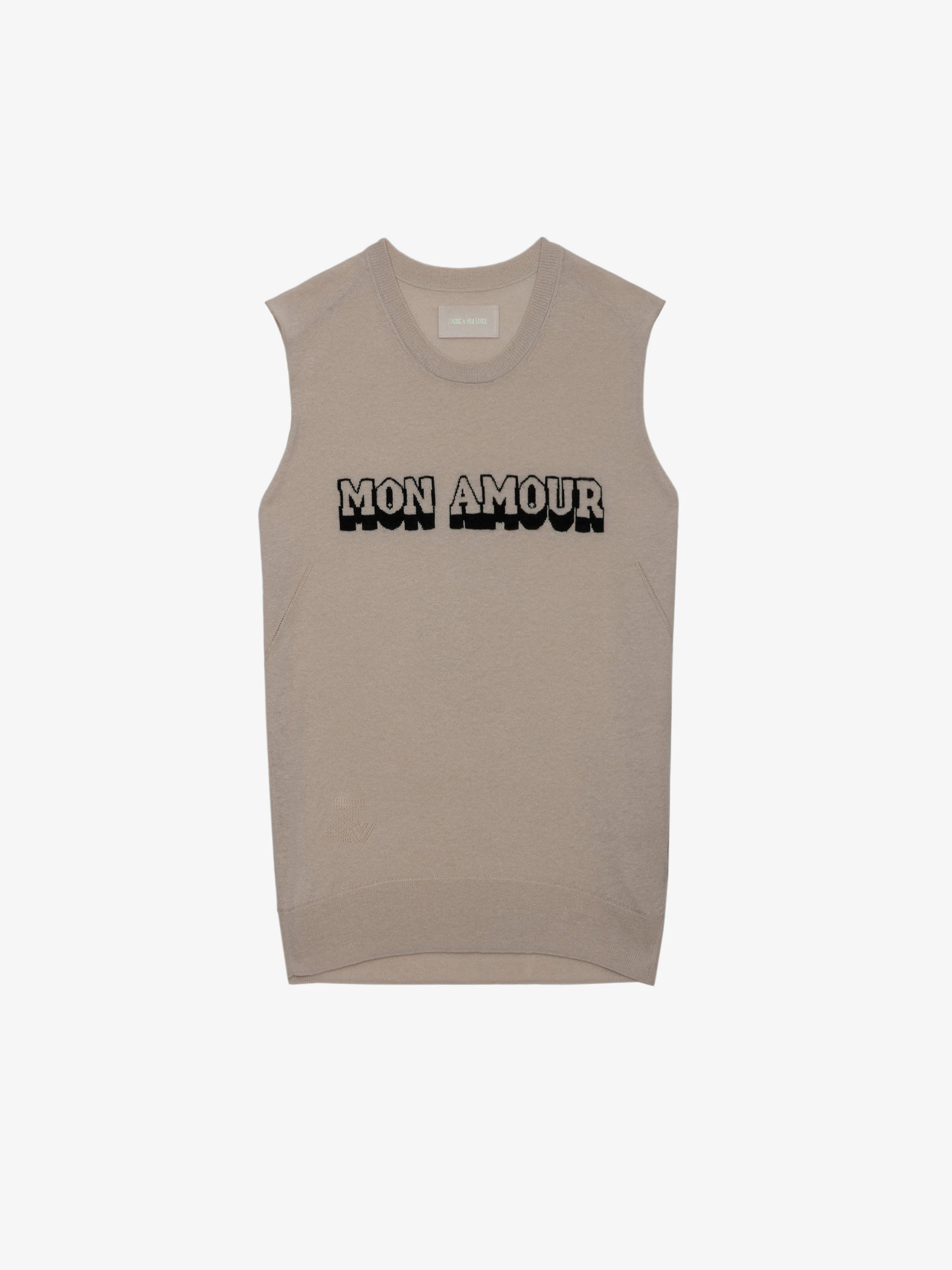 Light pink linen sleeveless top with intarsia jacquard “Mon Amour” slogan.