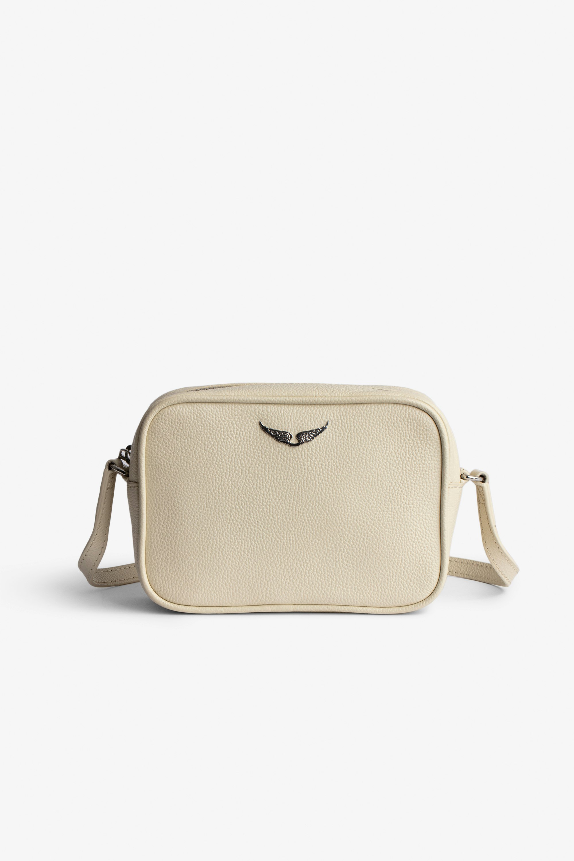 White leather bag with silver wings on front.