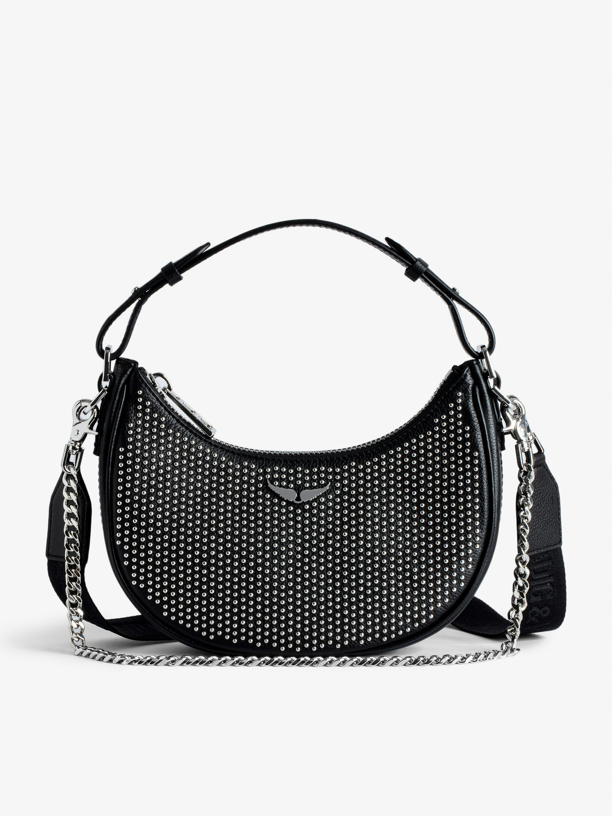 Women’s half-moon bag in black grained leather with a short handle, shoulder strap, chain and signature wings.