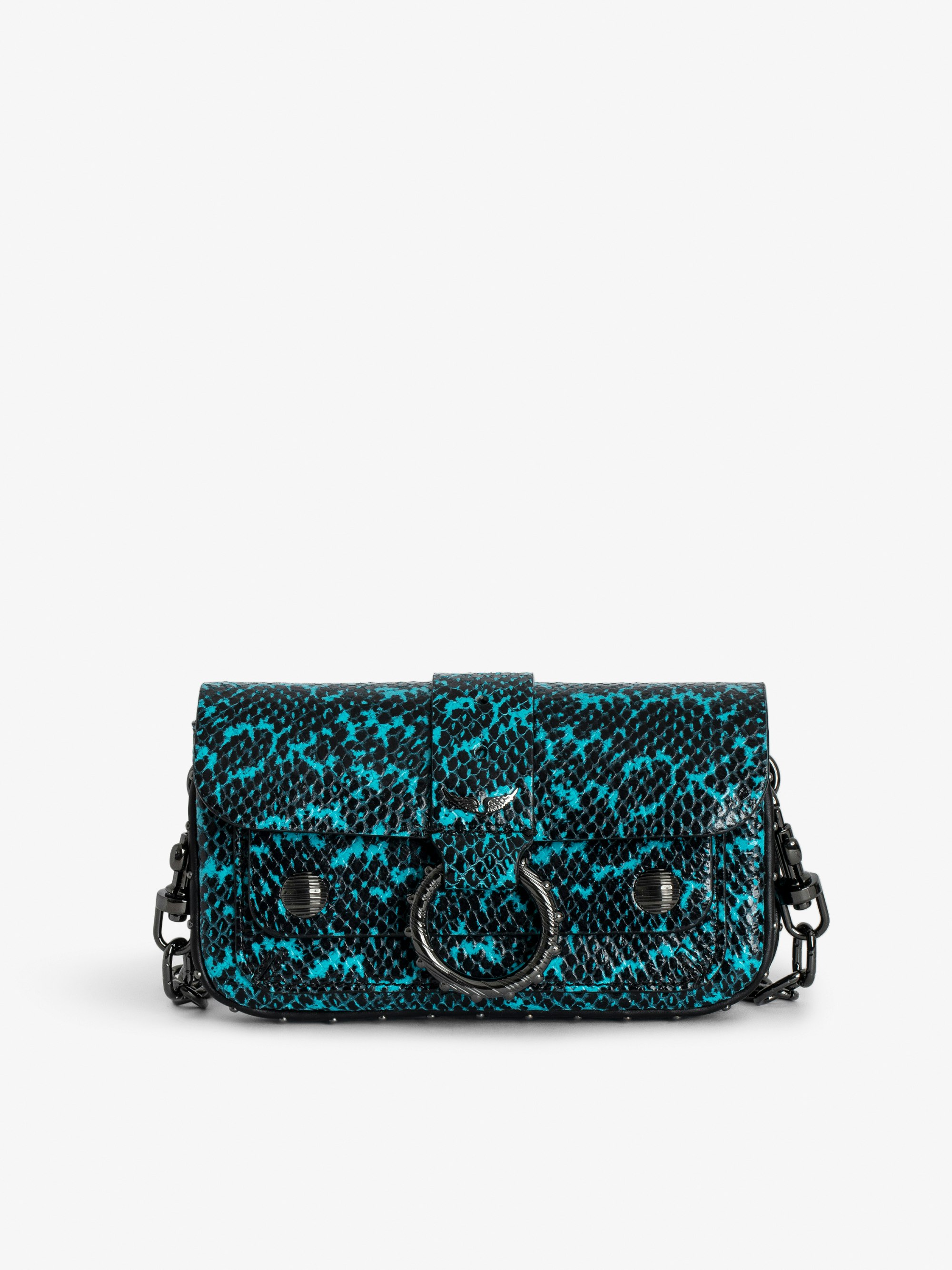 Blue snakeskin-effect leather mini bag with ring and chain.