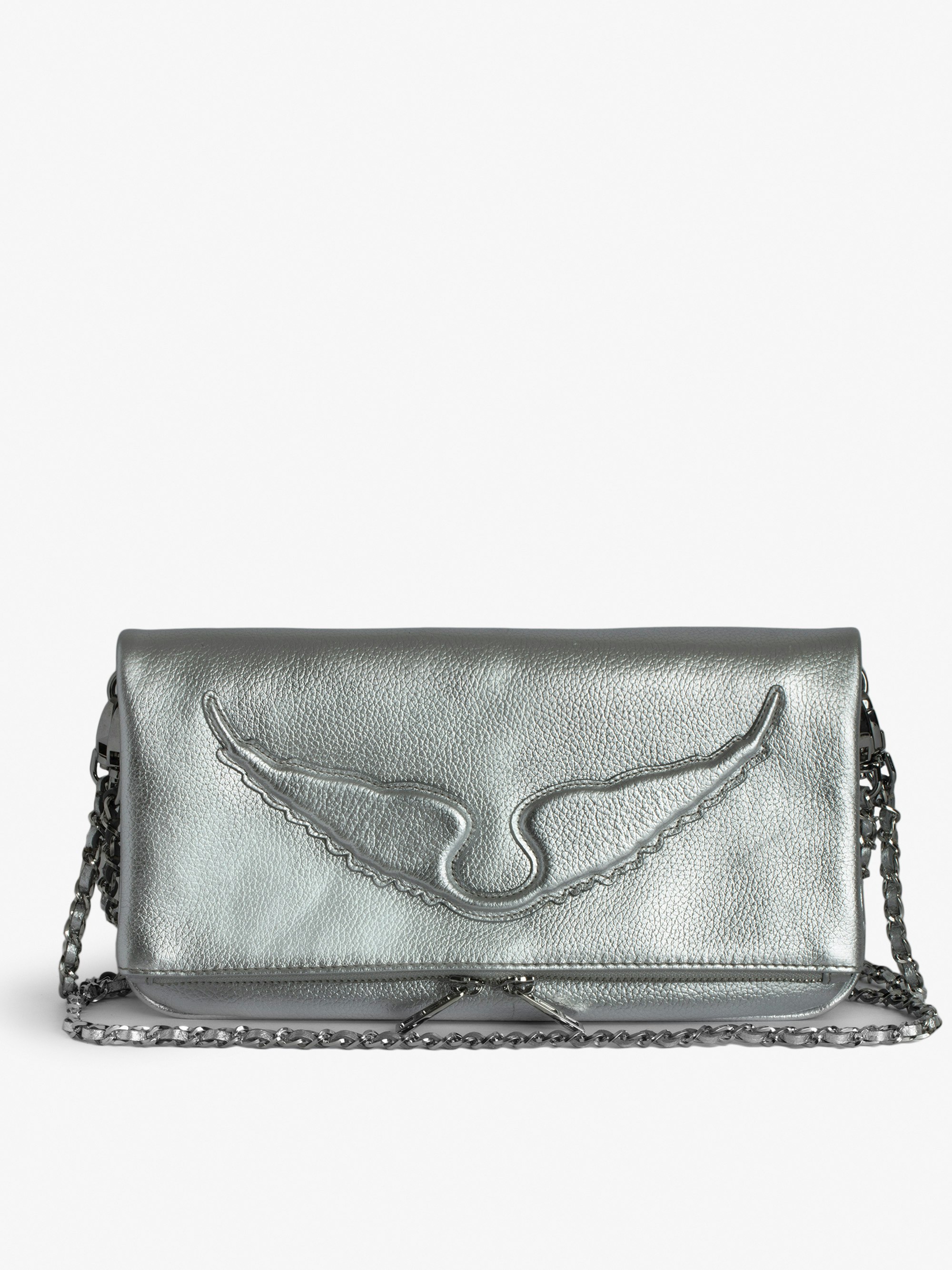 Silver-tone metallic grained leather clutch with double chain and signature embossed wings.