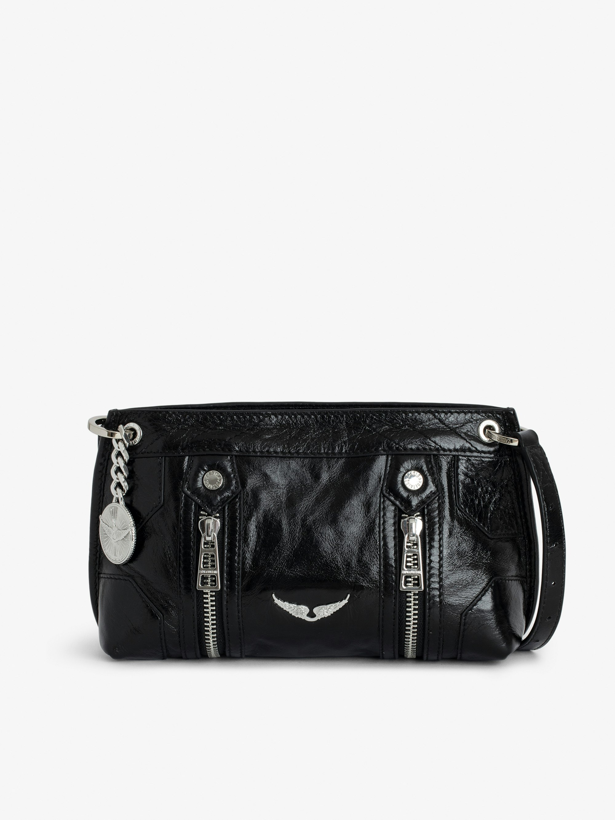 Black vintage-effect patent leather bag with medallion charm and signature wings.