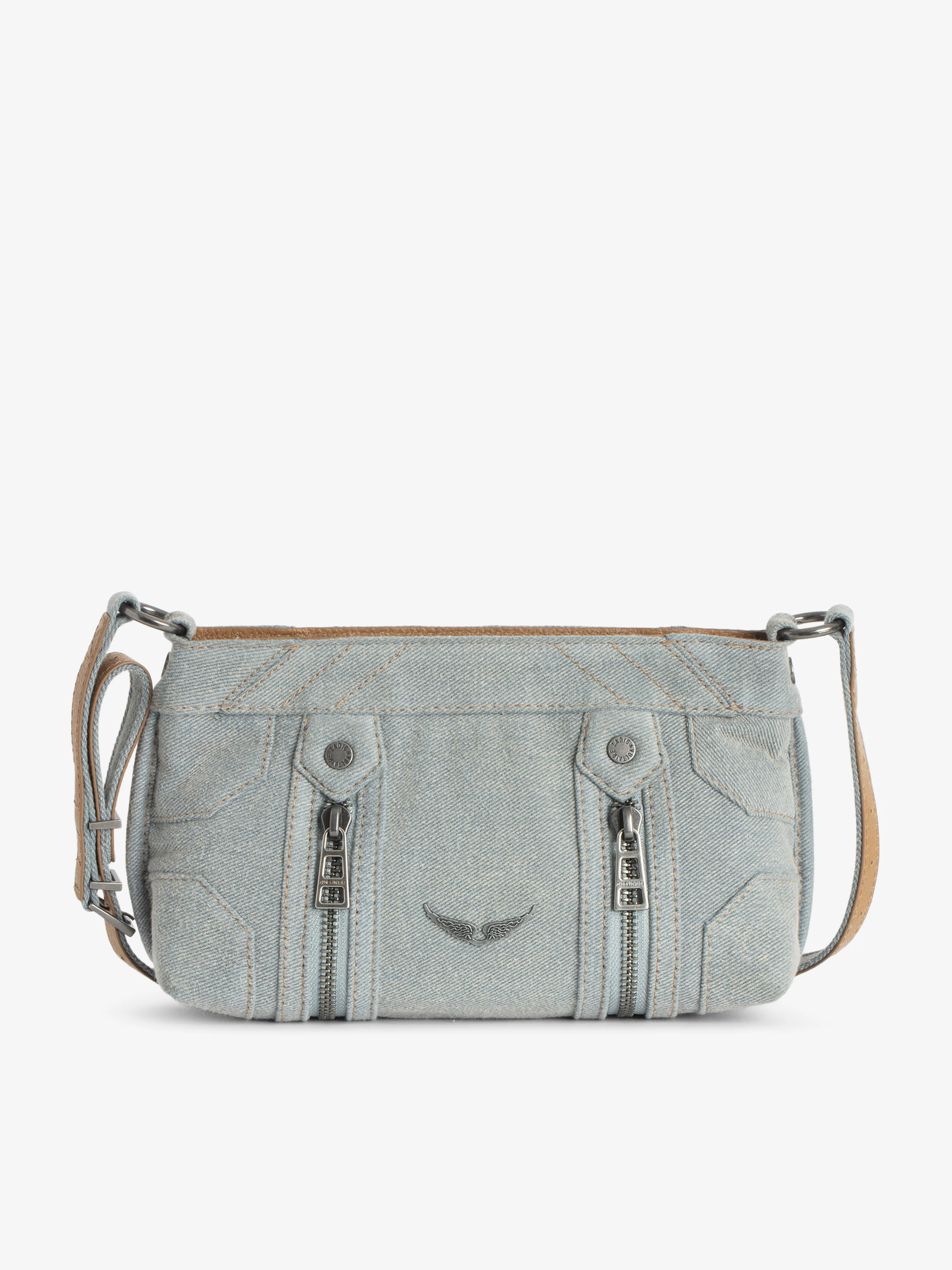 Small blue denim bag with adjustable shoulder strap and signature wings.See more