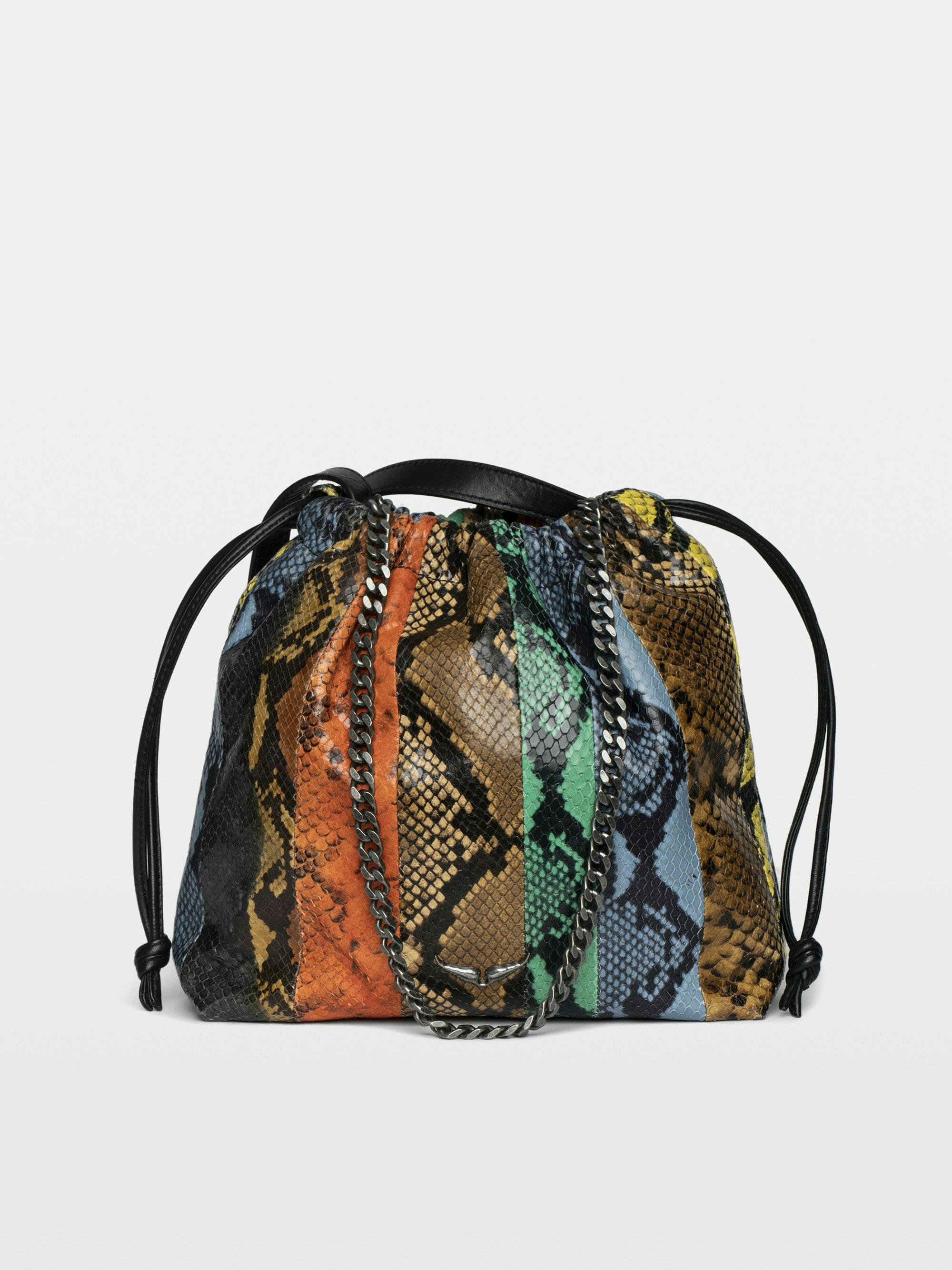 Patchwork leather bag with chain strap and wing signature.