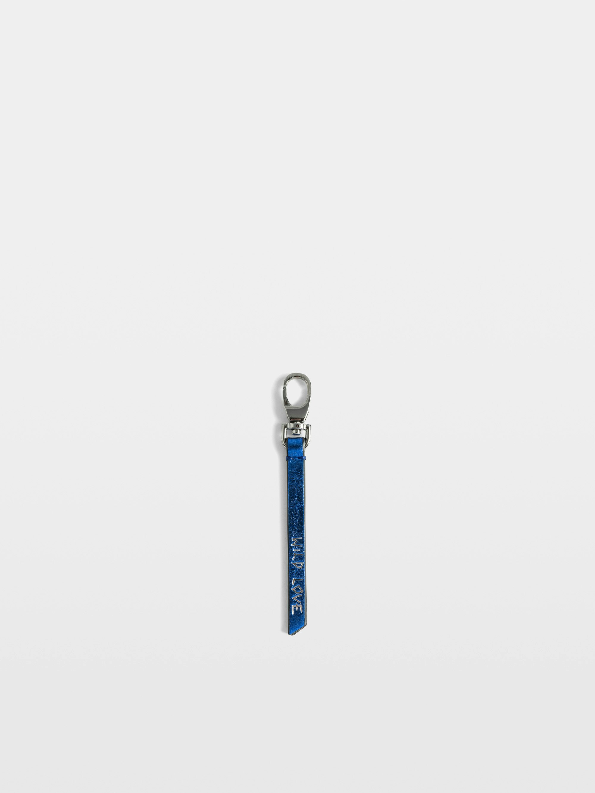 Keyring with grained leather strap featuring wild love message.
