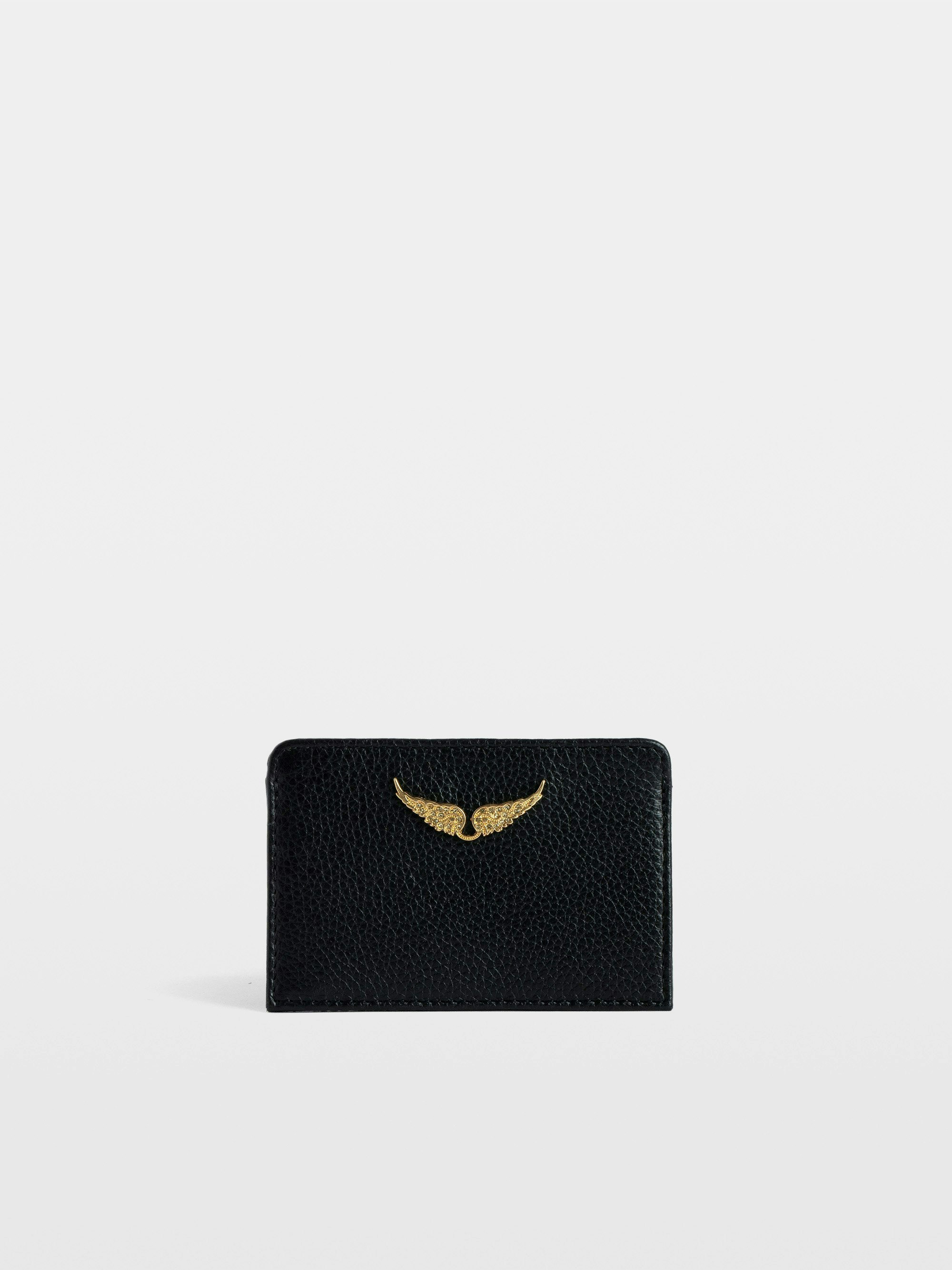 Black and gold-grained women's leather card holder with diamanté wings charm.