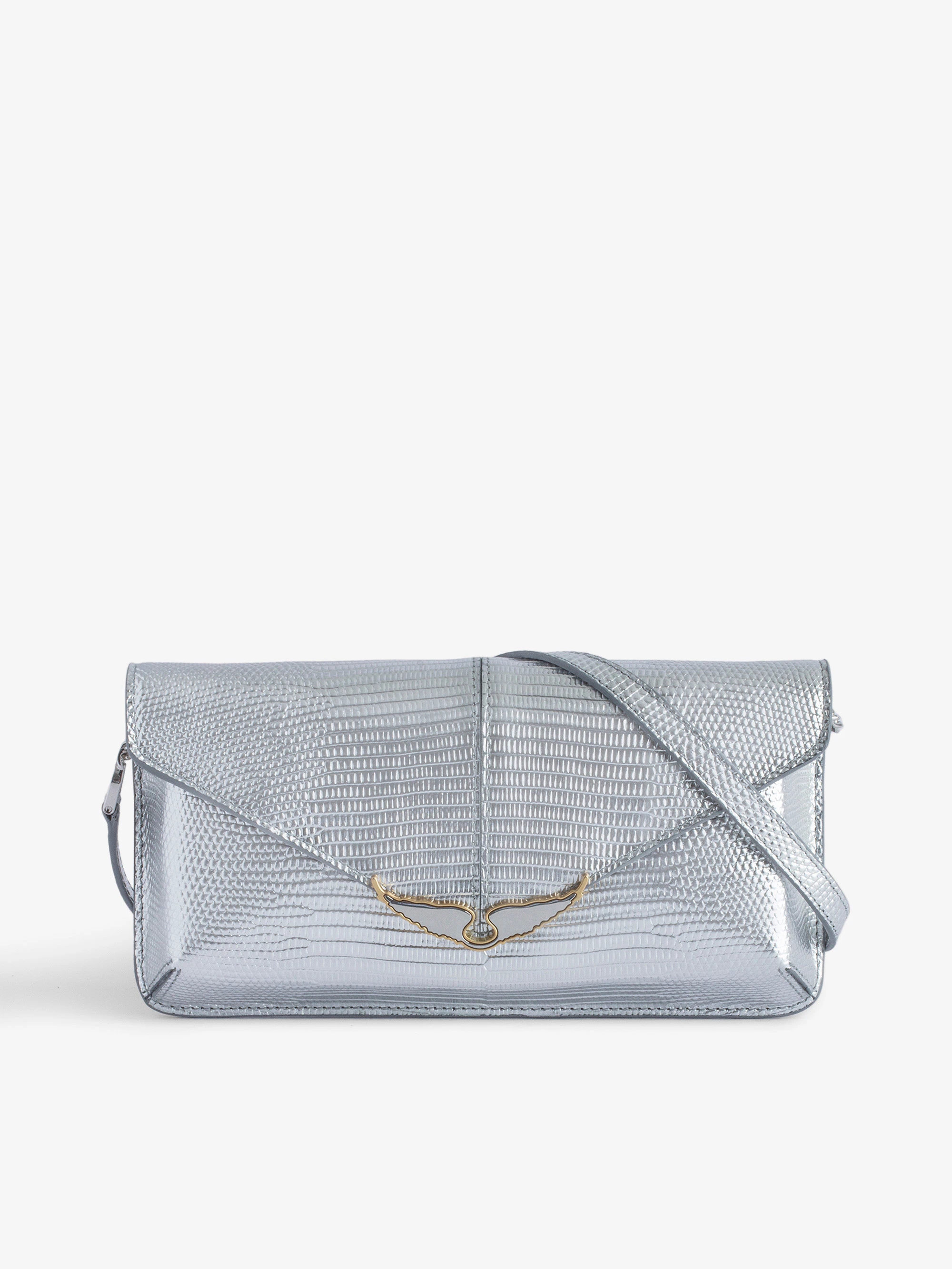 Silver metallic iguana-embossed leather clutch with leather and metal chain shoulder strap.See more