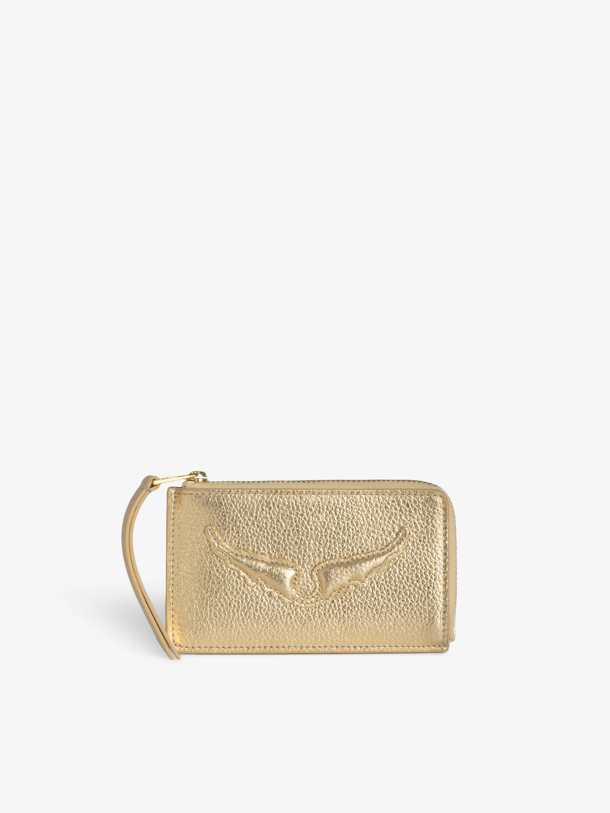 Gold-tone metallic grained leather card holder with embossed wings signature and debossed "We Should Kiss" message.See more