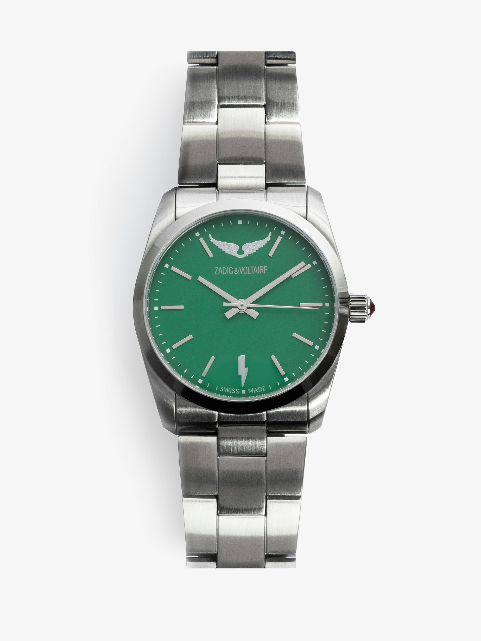 Switch to Zadig&Voltaire time with this stainless steel watch set with a rhinestone, with a matte green face in the signature style of the brand.