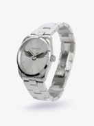Stainless steel watch with silver dial and wing motif.