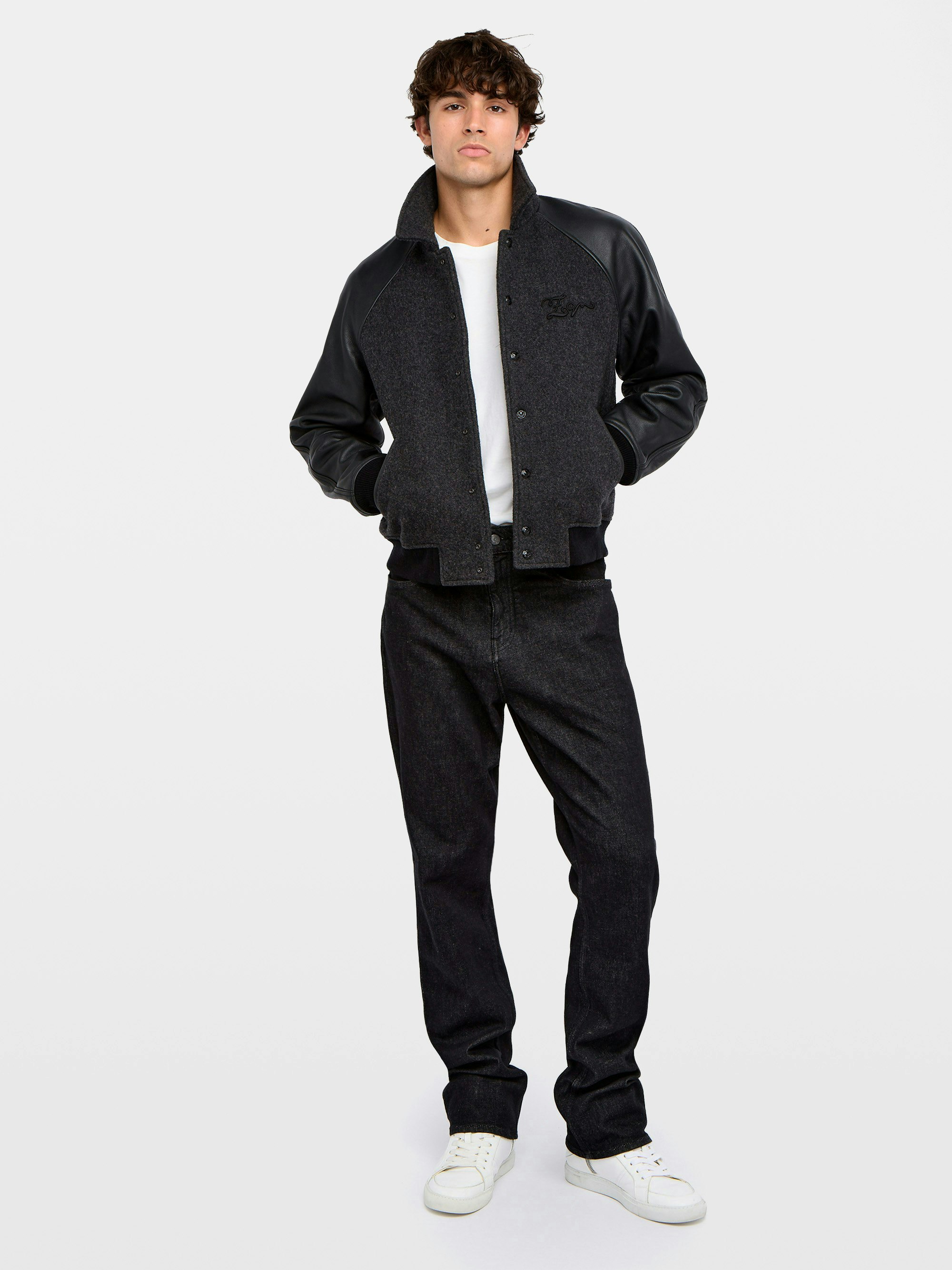 Bomber jacket in bi-material; body in wool and sleeves in slightly grained leather, double piped pocket, ZV chain stitch embroidery on the front and snake flock on the back.