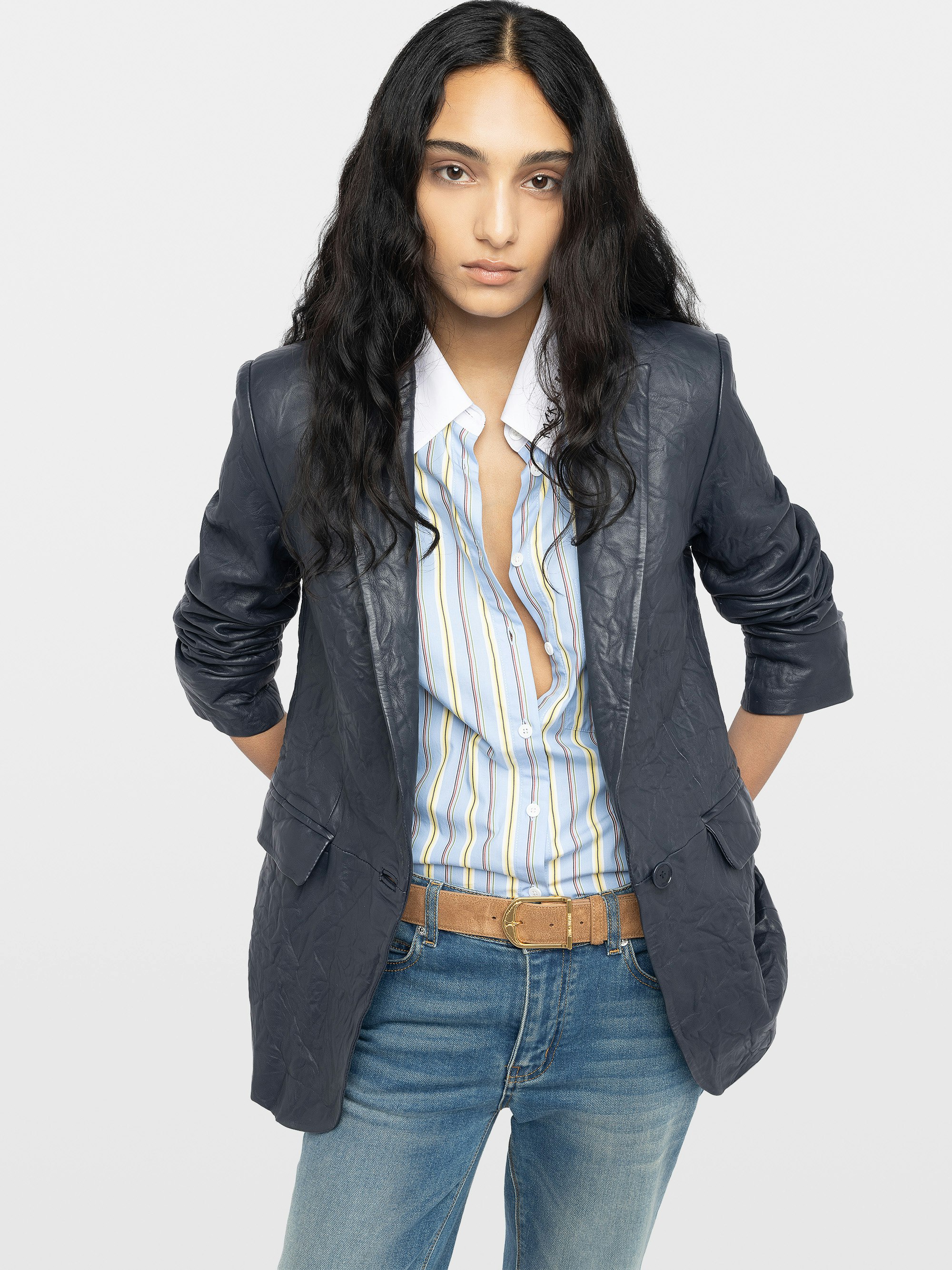 Straight-fit single-breasted blazer in crinkled leather.