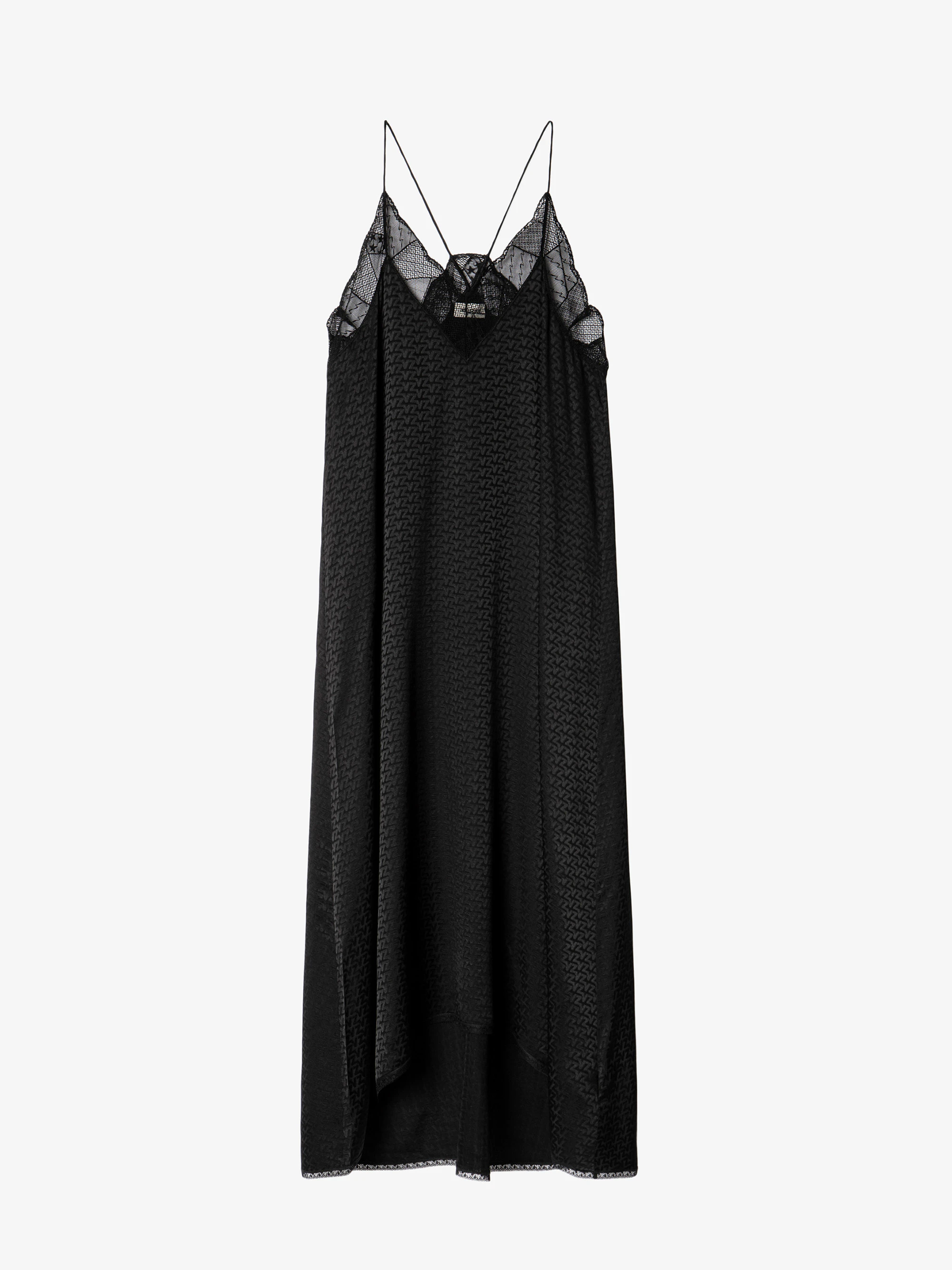 Zadig&Voltaire women’s black silk jacquard dress with ZV monogram, lace embellishment and a lingerie vibe.