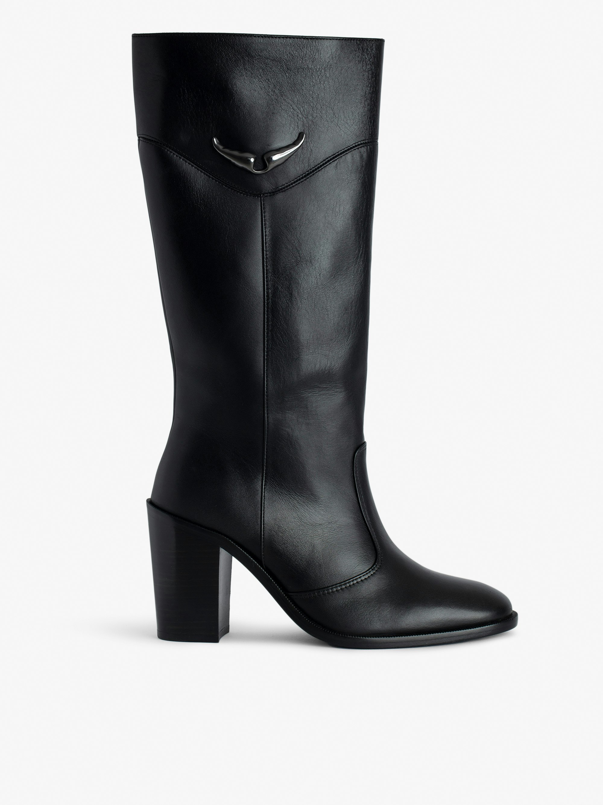 Women's black tall leather boots with wings charm on calves.