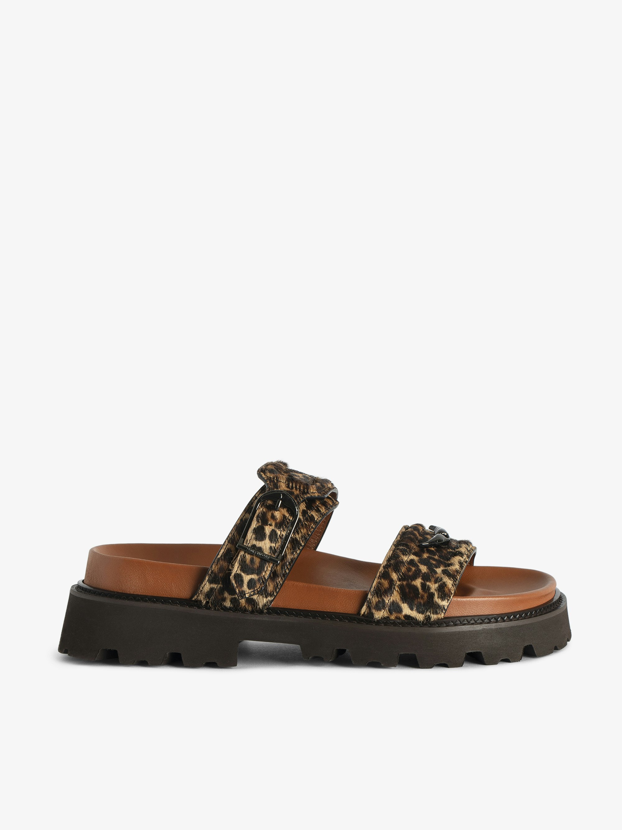 A bold fusion of edgy design and luxurious craftsmanship. These mules feature a striking leopard-effect leather exterior, exuding a wild yet sophisticated allure. An adjustable strap adorned with the brand's signature buckle and wing charm adds a distinctive touch, embodying a rebellious spirit. The moulded footbed ensures optimal comfort, while the chunky rubber sole provides both durability and a contemporary aesthetic.See more