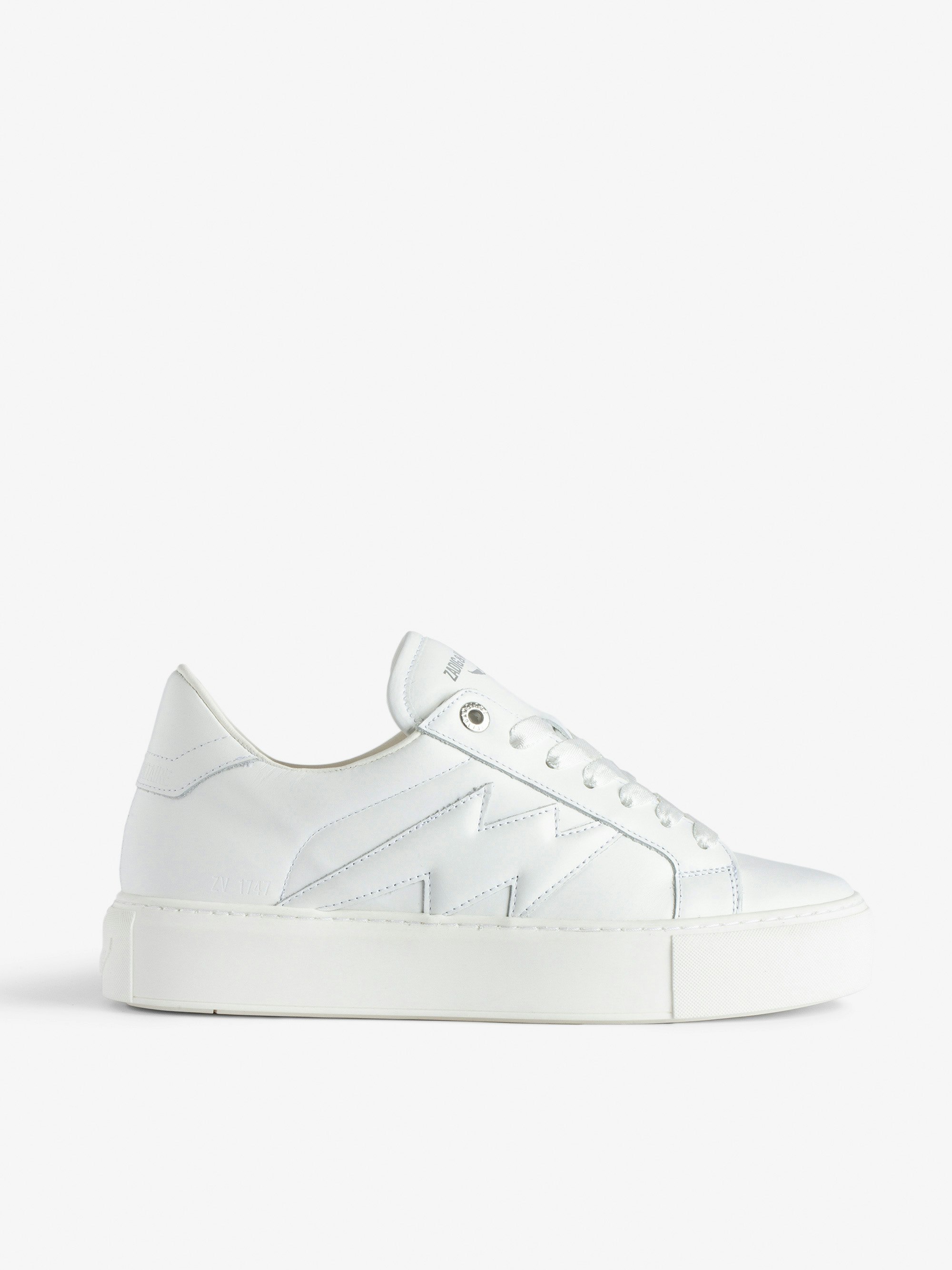 Women’s white smooth leather low-top sneakers with lightning bolt panels and chunky sole.See more