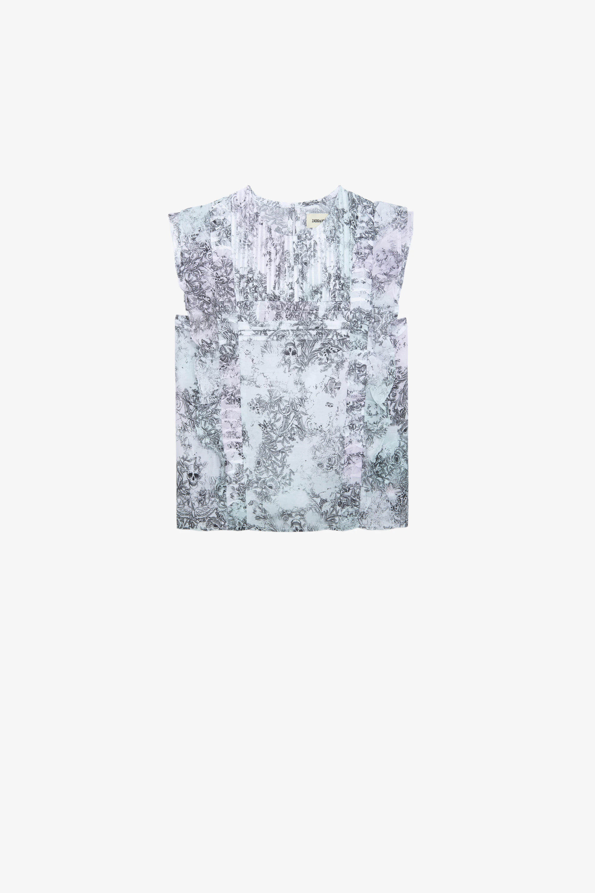 Girls' sleeveless ruffle blouse with floral skull print.