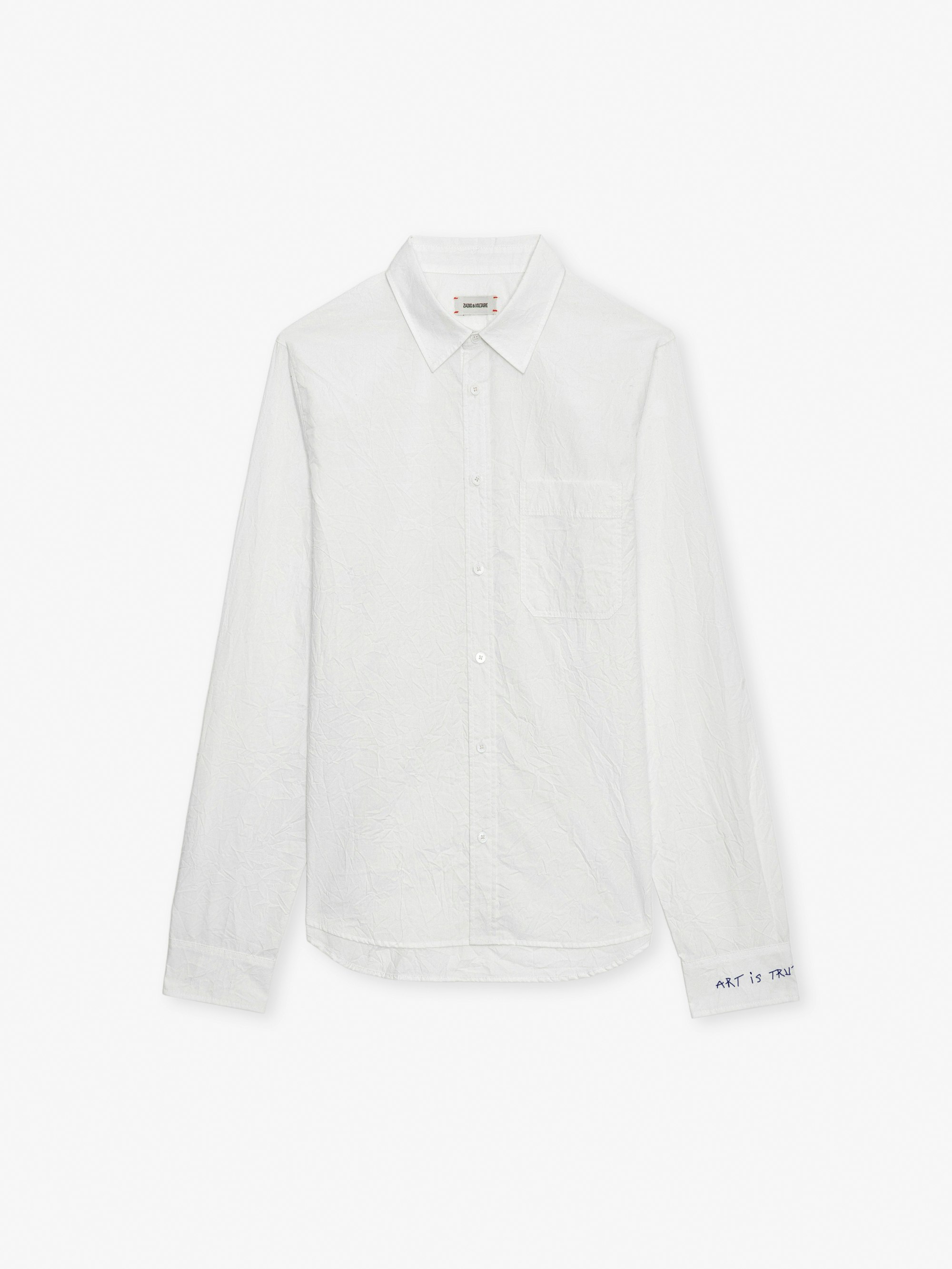 Long-sleeved white crinkle-effect organic cotton shirt with Artist Rules embroidery.
