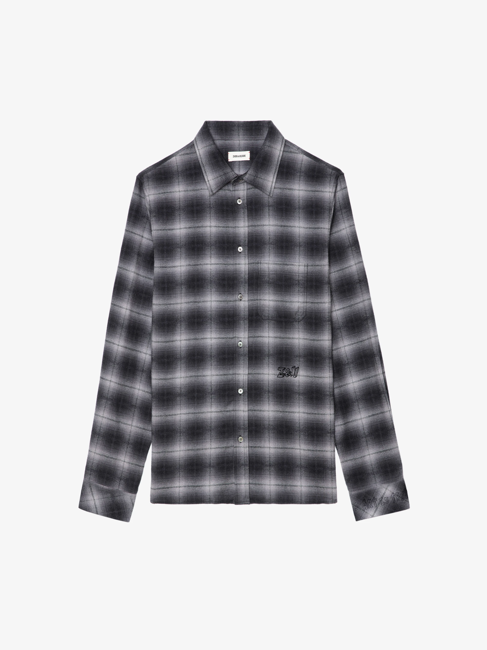 Long-sleeved grey cotton flannel check shirt with motifs and "Art Is Truth" embroidery.