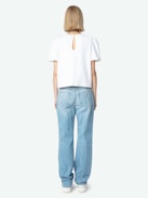 Women's straight leg light wash jeans.