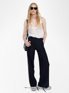 Wide-leg tailored pants with rhinestones.